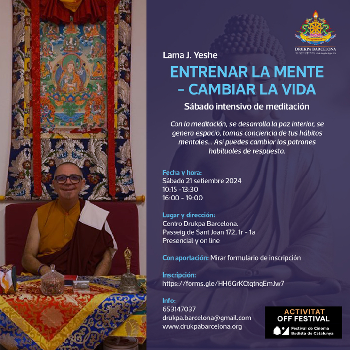 Sábado 21 septiembre 2024. Sábado intensivo de meditación. ENTRENAR LA MENTE – CAMBIAR LA VIDA. A cargo de Lama Jigme Yeshe. Activitat Off FCBC.