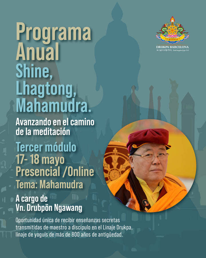 - Cuatro módulos en cuatro sábados, mañana y tarde, de estudio y práctica sobre Shine y Lhagtong a cargo de Lama Jigme Yeshe, responsable espiritual de Drukpa Barcelona.