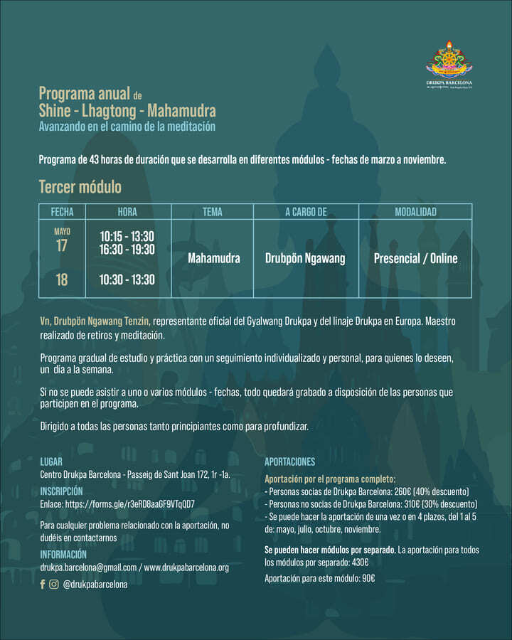 - Un módulo de dos horas y dos módulos en dos fines de semana sobre mahamudra a cargo de Vn. Drubpön Ngawang Tenzin, representante del Gyalwang Drukpa en Europa.