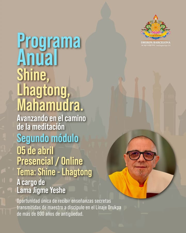 - Cuatro módulos en cuatro sábados, mañana y tarde, de estudio y práctica sobre Shine y Lhagtong a cargo de Lama Jigme Yeshe, responsable espiritual de Drukpa Barcelona.