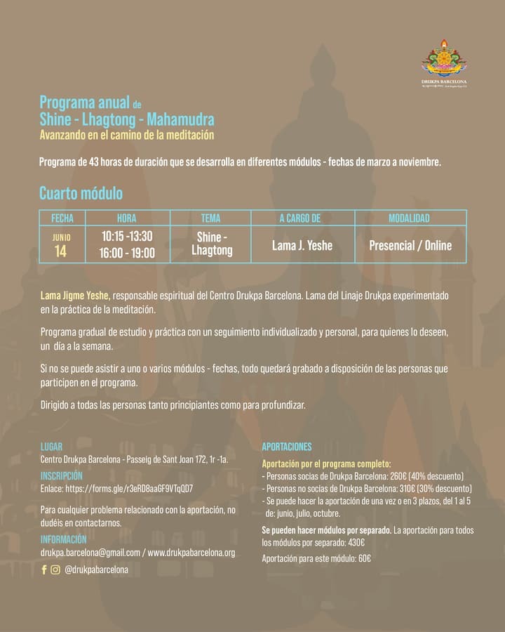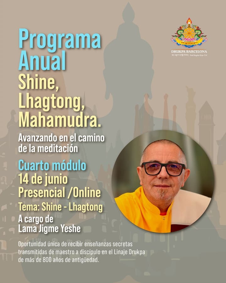 • Cuatro módulos en cuatro sábados, mañana y tarde, de estudio y práctica sobre Shine y Lhagtong a cargo de Lama Jigme Yeshe, responsable espiritual de Drukpa Barcelona.