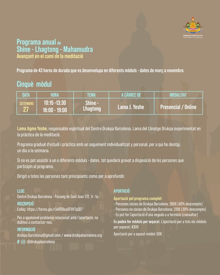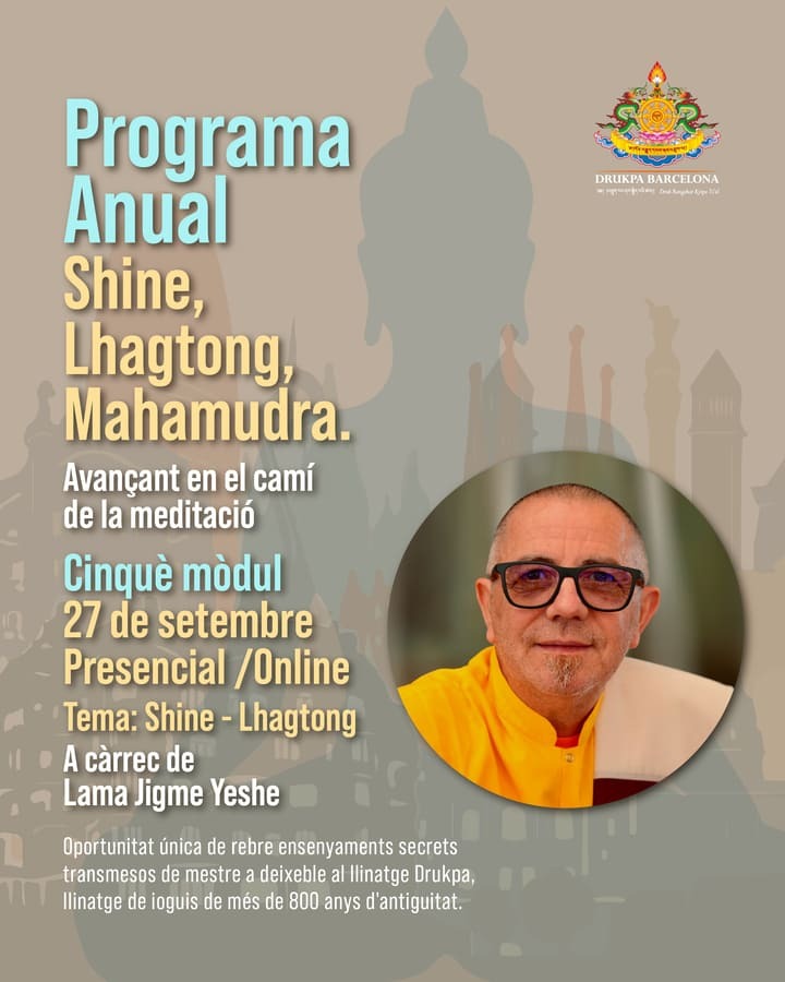 – Quatre mòduls en quatre dissabtes, matí i tarda, d´estudi i pràctica sobre Shine i Lhagtong a càrrec de Lama Jigme Yeshe, responsable espiritual de Drukpa Barcelona.